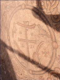 Die Haupthalle enthält ein Kreuz in einem Kranz von über einem Meter Durchmesser. Rechts und  links des Kreuzes die griechischen Buchstaben  Alpha und Omega, umrahmt von vier pickenden  Vögeln, ungewöhnlich gegenüber anderen  Kreuzsdarstellungen. Da das Kreuz sich im  Fußboden befindet, deutet das auf das vierte  Jahrhundert hin, denn später war es verboten,  Kreuze im Fußboden darzustellen, damit man das Kreuz nicht mit Füßen tritt.