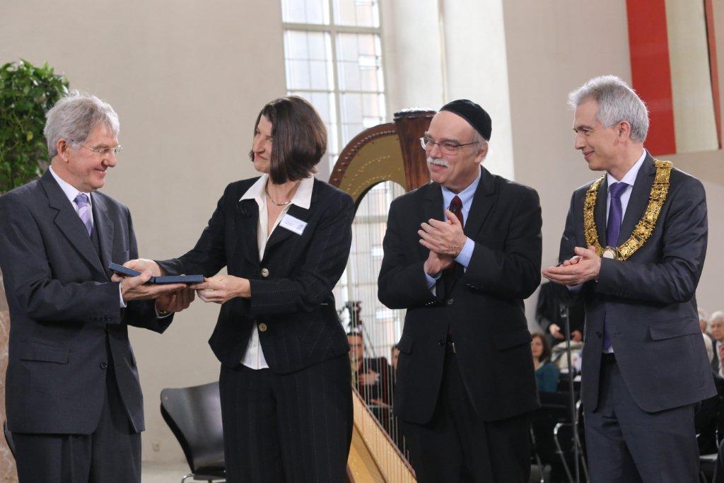 Die katholische Präsidentin des DKR, Dr. Margaretha Hackermeier, überreicht dem Vorsitzenden der KLAK die Buber-Rosenzweig-Medaille. Rechts daneben der jüdische Präsident des DKR, Rabbiner Andreas Nachama, und Frankfurts Oberbürgermeister Peter Feldmann